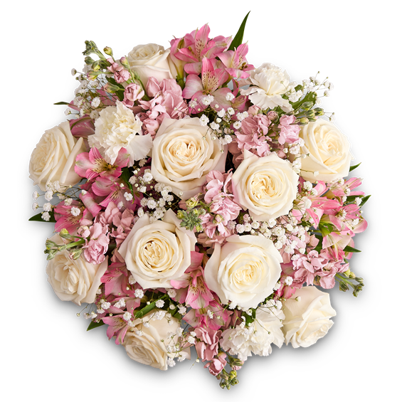 • All-around arrangement with white roses and carnations, pink Peruvian lilies (alstroemeria) and stock; accented with baby’s breath and assorted greenery